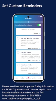 The Complete App features personalized injection and symptom logging, medication reminders, and goal setting to support and encourage you throughout treatment. Your Complete App keeps you in the know of what HUMIRA, RINVOQ, and SKYRIZI can do for you.