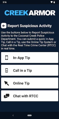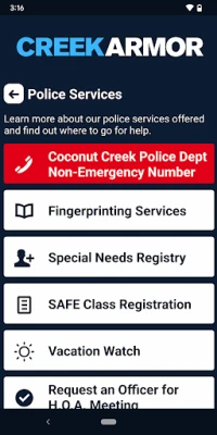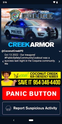 CREEKARMOR is the official safety app of the Coconut Creek Police Department. It is the only app that integrates into the agency’s centralized technology known as the Real Time Crime Center, which provides an added layer of safety and security to the Coconut Creek community. The application is packed full of resources, to include crime prevention tips, online police services, a panic button feature and the ability to report suspicious activities in real-time. The app will send you important safety alerts to keep you in the know when you need it the most.