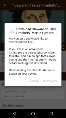 If you live in an area where Christians are persecuted, consider to install and run an app that allows you to use the Internet anonymously before installing the app and downloading audio files from Martin Luther Sermons.