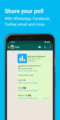 Share your poll via WhatsApp, WeChat, Telegram, Facebook, Mail, and more. It works on every platform as it's plain text!
