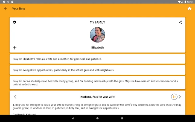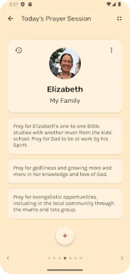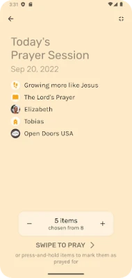 Every day, Prayer Mate will select a person or topic that you've entered from each of your main categories (perhaps "My family" or "My small group at church") and show them to you as a series of index cards - then just swipe between them to pray.