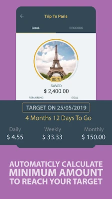 Add your goal image to motivate you and set your target date and lets this app calculate the minimum amount you need to save every month, week or daily to make sure you reach your goals on time.