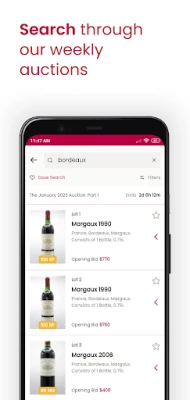 Spectrum Wine Auctions is committed to offering buyers and sellers alike the most accessible and expansive auction opportunities for what is simply the world’s greatest consumable and collectible product—wine. Now you can have complete access to all of Spectrum Wine’s resources and functions through your Android. The Spectrum Wine Auctions application makes finding and buying fine wine easier than ever! * View auction highlights. * Search auctions and sessions. * View images of auction lots. * Filter searches by bottle size, type, vintage, and more. * Place bids on lots. * Track lots you have bid on, have consigned, or are watching. * Save bids to your device to place later. * Save your favorite search phrases to your device.