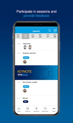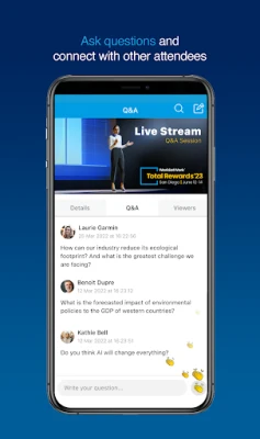 • Content and logistics: personalized agenda with breakout sessions and logistics, floor plans, notes, questionnaires, session feedback, group messaging, time-activated content and live updates of the meeting activities • Networking: List of participants, instant messaging, business card exchanges • Interactivity: Voting and Q&A